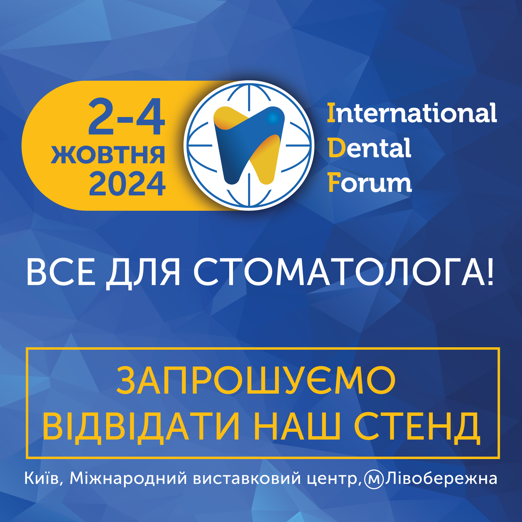 We are pleased to invite you to the main event of the year in the dental industry - the International Dental Forum exhibition, which will be held from October 2 to 4 in Kyiv, at the International Exhibition Center, at the address: Brovarskiy prospekt, 15