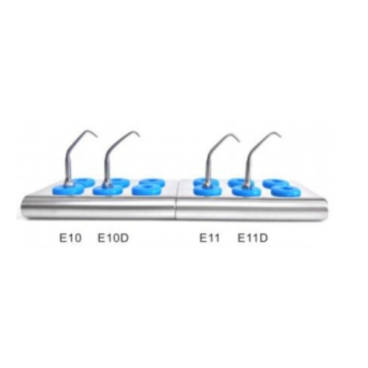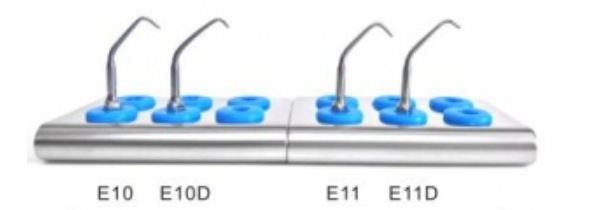 - E-10D: Використовується для ретроградної обробки кореневого каналу та ефективного полірування верхівки кореня зуба. Форма вигнута, коротка робоча частина (довжиною 3,3 мм) покрита діамантовим напиленням - 40 мкм.