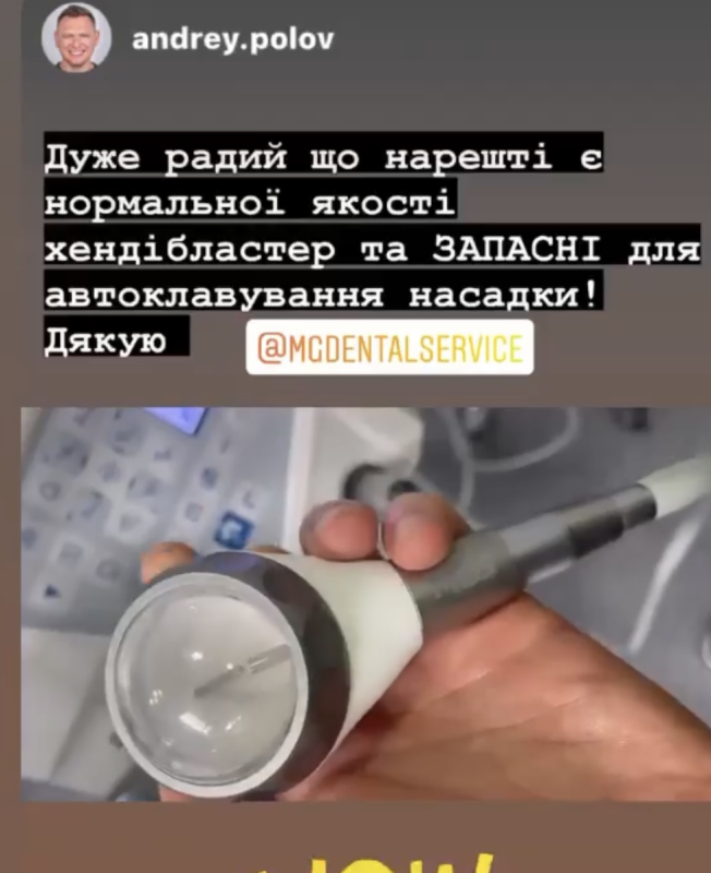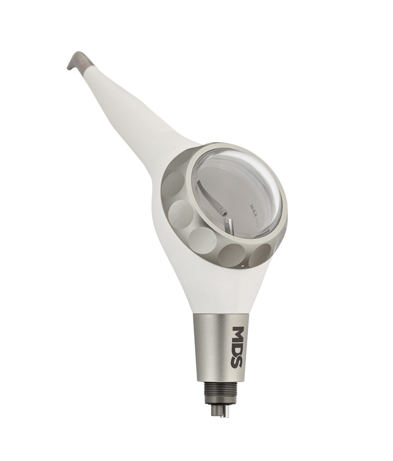 Декілька років працюю хендібластерами MDS. Маю дві моделі, але особливої уваги заслуговує Handy Junior, який переважно використовую на протязі 1.5 року Одним з важливих критеріїв для мене ергономічність-хендібластер досить легкий і зручно розміщується в руці, що не викликає втоми навіть при тривалій роботі з ним. При цьому досить об'ємний резервуар для порошку дозволяє не відволікатися ще раз для його додавання. За рахунок оптимальної конфігурації сопел, повітряно-порошковий струмінь йде спрямовано без зайвого розбризкування, завдяки цьому отримуємо добрий очищаючий ефект, мінімальну травму слизової (а отже, і меншу кровоточивість ясен) і економічне витрачання порошку. При належному догляді (очищення, стерилізація) та використанні якісних порошків, проблем з експлуатацією (забиванням порошку) не спостерігала.